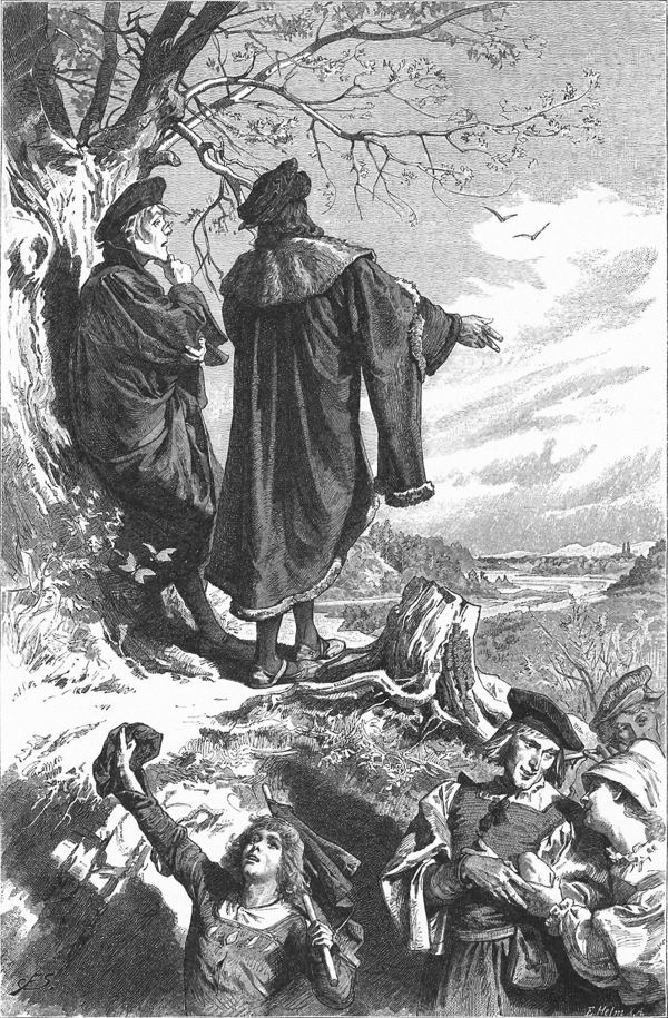 FaustVom Eise befreyt sind Strom und Bäche,Durch des Frühlings holden, belebenden Blick,Im Thale grünet Hoffnungs-Glück;Der alte Winter, in seiner Schwäche,Zog sich in rauhe Berge zurück.Von dorther sendet er, fliehend, nurOhnmächtige Schauer körnigen EisesIn Streifen über die grünende Flur;Aber die Sonne duldet kein Weißes,Ueberall regt sich Bildung und Streben,Alles will sie mit Farben beleben;Doch an Blumen fehlts im Revier,Sie nimmt geputzte Menschen dafür.Kehre dich um, von diesen HöhenNach der Stadt zurück zu sehen.Aus dem hohlen finstren ThorDringt ein buntes Gewimmel hervor.Jeder sonnt sich heute so gern.Sie feyern die Auferstehung des Herrn,Denn sie sind selber auferstanden,Aus niedriger Häuser dumpfen Gemächern,Aus Handwerks- und Gewerbes Banden,Aus dem Druck von Giebeln und Dächern,Aus der Straßen quetschender Enge,Aus der Kirchen ehrwürdiger NachtSind sie alle ans Licht gebracht.Sieh nur sieh! wie behend sich die MengeDurch die Gärten und Felder zerschlägt,Wie der Fluß, in Breit’ und Länge,So manchen lustigen Nachen bewegt,Und, bis zum Sinken überladenEntfernt sich dieser letzte Kahn.Selbst von des Berges fernen PfadenBlinken uns farbige Kleider an.Ich höre schon des Dorfs Getümmel,Hier ist des Volkes wahrer Himmel,Zufrieden jauchzet groß und klein:Hier bin ich Mensch, hier darf ich’s seyn.WagnerMit euch, Herr Doctor, zu spazierenIst ehrenvoll und ist Gewinn;Doch würd’ ich nicht allein mich her verlieren,Weil ich ein Feind von allem Rohen bin.Das Fiedeln, Schreien, Kegelschieben,Ist mir ein gar verhaßter Klang;Sie toben wie vom bösen Geist getriebenUnd nennen’s Freude, nennen’s Gesang.Bauernunter der Linde. Tanz und Gesang.