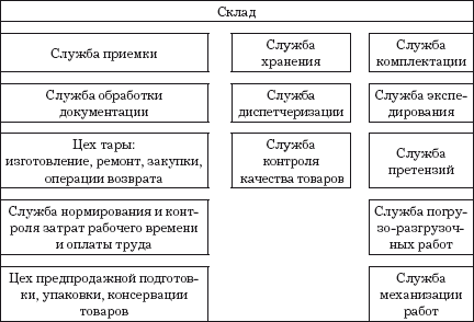 Склад обычно выделяют в отдельную структуру, исполняющую только стандартные операции – разгрузка, приемка, размещение, хранение, учет, комплектация партий для отгрузок по заказам, подготовка к отгрузке, погрузка, экспедирование, а также вспомогательные операции по обеспечению жизнедеятельности склада – уборка, ремонт оборудования и помещения и т. д. В крупных складах существует транспортный отдел или экспедиция, организующие отгрузки. На складах имеются учетно-расчетный отдел, сторожевая и пожарная охрана. Функции закупок товара, управления запасами и реализации поручают отдельным от склада службам.