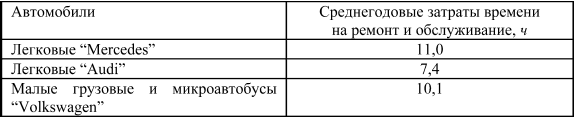 Среднегодовые затраты времени на ремонт и обслуживание одного автомобиля – эмпирический показатель, определяемый для машин одной марки, совокупно по всем моделям и по всем категориям срока службы. Например, для автомобилей в 2001–2002 гг. некоторыми автокомпаниями для расчетов были приняты следующие показатели.