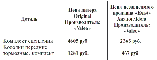 Автодилеры во всем мире торгуют автомобилями главным образом для того, чтобы закрепить покупателей машин за своим сервисом, т. е. сервис у них – основной бизнес. Только в России руководители некоторых дилерских фирм видят себя не исполнителями бытовых услуг, а VIP-персонами от автопроизводителей. Они ориентированы лишь на объем выручки от реализации автомобилей, а сервис и магазин запчастей считают досадными второстепенными обязанностями, сопутствующим бизнесом. Политики цен на запасные части у многих российских импортеров и дилеров в том смысле, как ее понимают зарубежные дилеры, пока нет. Отсутствие политики цен выразилось в бегстве клиентов не только после гарантийного периода, но и во время него. Ниже приведено сравнение цен 2010 г. официального дилера и независимого торговца на некоторые ходовые конкурирующие детали автомобиля класса «А» одного и того же изготовителя – компании «Valeo», одной из 30 крупнейших поставщиков компонентов для автопроизводителей.