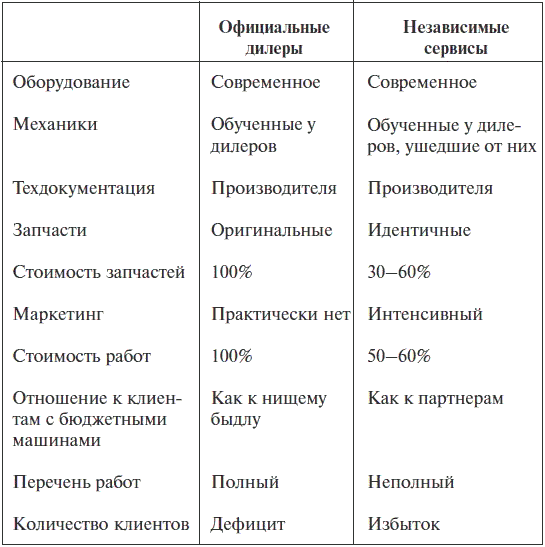 – дали мощный толчок развитию независимого сервиса, обеспечивая конкурентов обученными кадрами, уступая заказы на ремонт. От дилеров, ограничившихся регламентным сервисом, и от дилеров-мошенников уходят способные механики, которым неинтересно делать только стандартные ТО и которым противно становиться ворами.