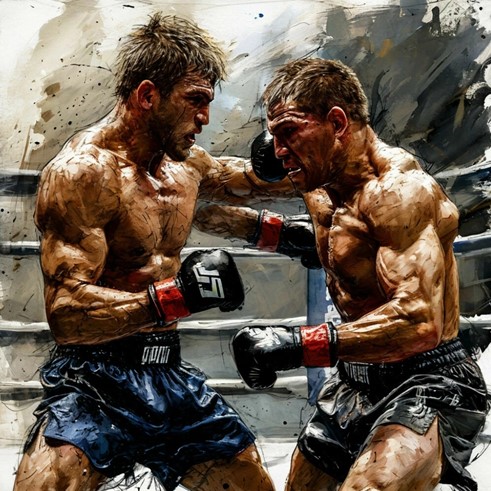 Вновь звучит гонг. Выхожу к середине ринга, протягиваю кулаки. Он бьёт мне по перчаткам. Второй раунд. Смотрю в его глаза. Он злится. Значит, будет делать ошибки. В этот раз противник не стал держать дистанцию, а начал резво чередовать удары правой и левой. Я три раза увернулся, заметил, как он открылся и пробил. Он опять устоял. Пора действовать. Делаю ложный замах, наношу удар, бью по корпусу. Он зажимает меня руками. Я отталкиваюсь и падаю на него. Сажусь ему на живот и пытаюсь пробить ему по лицу. Закрывается руками и пытается вывернуться из этого неприятного для него положения. Гонг. Второй раунд. Расходимся.