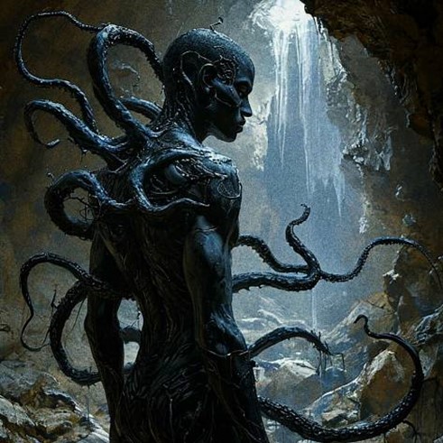 Из тумана возникло существо: высокий мужчина с гладкой кожей, покрытой слизью. Десятки длинных щупалец, росли прямо из его спины и извивались вокруг, словно змеи, готовые атаковать. Чёрные, бездонные глаза существа проникали в самую душу, лишая воли.