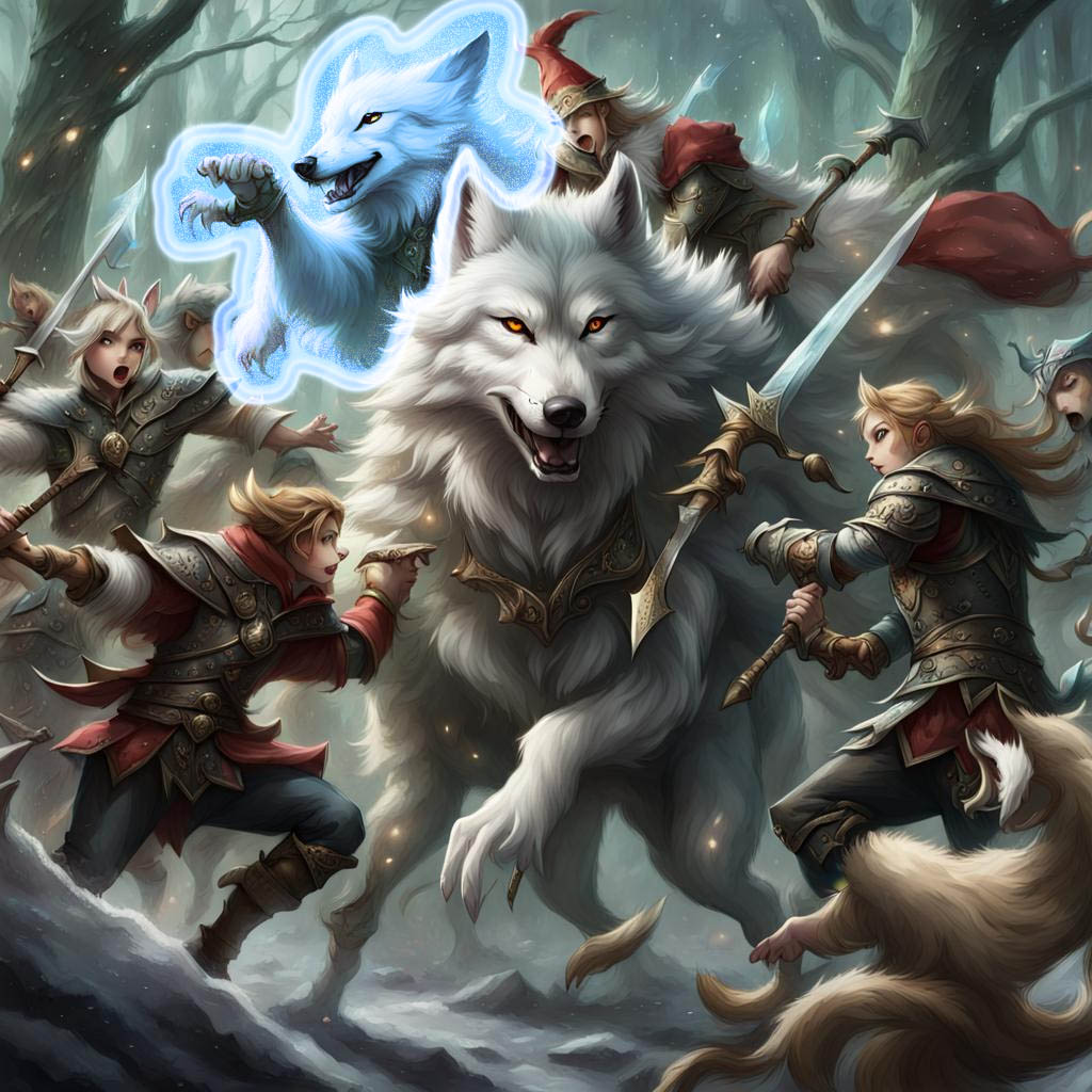 Лунгард осторожно подходит, эльфы начинают нападать на волка. Но ловкий могучий волк, обладающий магией, начинает атаковать и разносить эльфов.