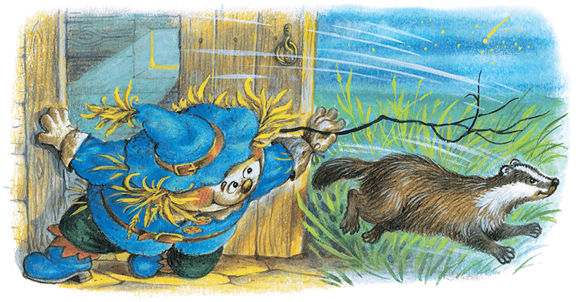 Он, затаившись, подпустил врага к самой двери (врагом этим был молодой барсук, о чём Страшила, конечно, не знал). И когда барсучишка уже просунул в дверь свой любопытный нос, принюхиваясь к соблазнительному запаху, Страшила стегнул его прутиком по жирной спине.