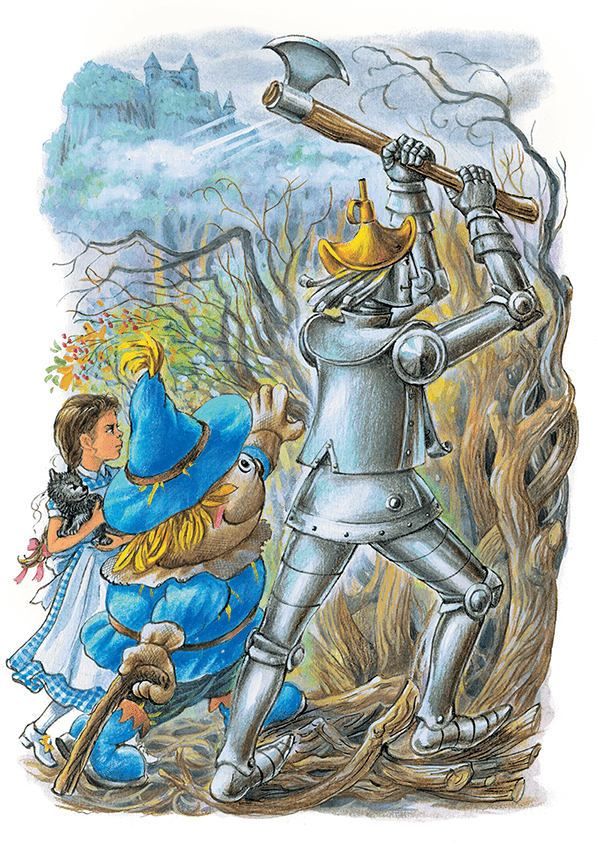 Скоро путники пришли к месту, где дорога заросла кустарником и стала непроходимой. Но Железный Дровосек заработал своим огромным топором и быстро расчистил путь.