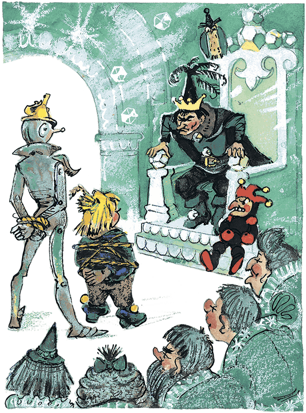Урфин Джюс содрогнулся при мысли о том, что мог сделать с его армией этот богатырь, если бы его не схватили обманом. Железный Дровосек бесстрашно встретил испытующий взгляд диктатора, а тот сделал знак Билану, и предатель рысцой выбежал из зала.