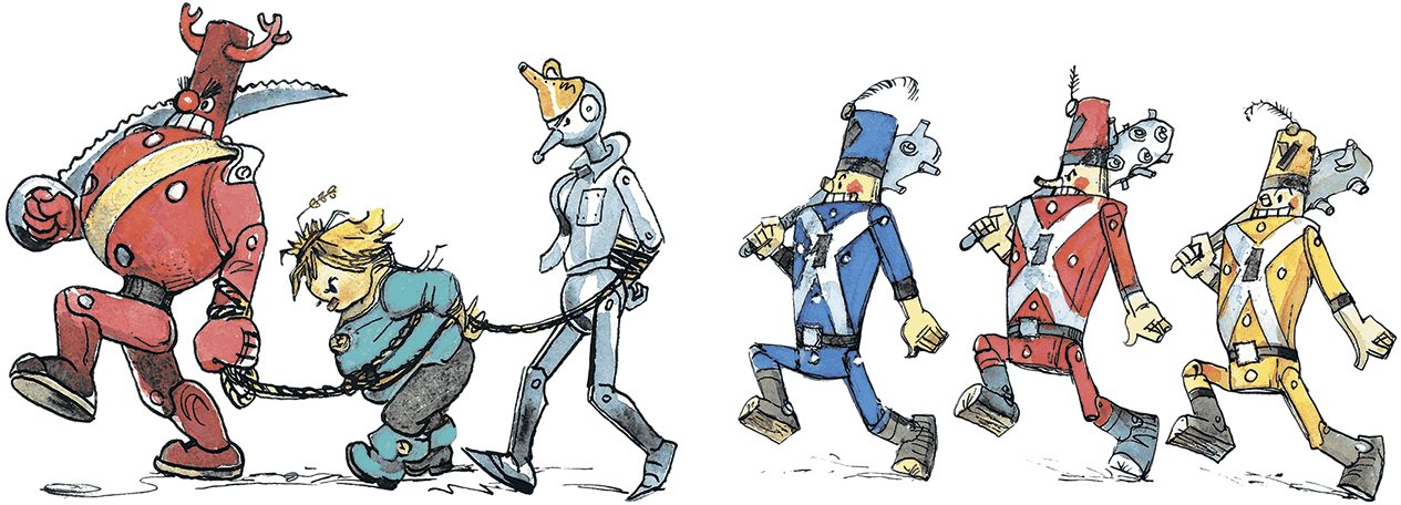 Грянул оркестр. Но это был не тот оркестр, искусная игра которого славилась в стране. Несмотря на угрозы, музыканты отказались играть, и инструменты были переданы придворным и деревянным солдатам. Дуболомы получили ударные инструменты: барабаны, тарелки, треугольники, литавры. А придворным дали духовые: трубы, флейты, кларнеты.