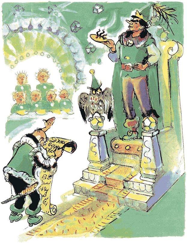 Урфин восседал во главе стола, на троне Гудвина, который нарочно перенесли сюда из тронного зала, чтобы всегда напоминать о величии завоевателя. Изумруды были вынуты отовсюду, кроме трона, и когда на нем восседал Урфин Джюс, сияние драгоценных камней делало выражение мрачного сухого лица диктатора еще более неприятным.