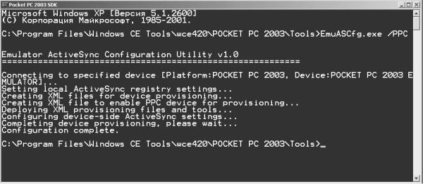 4. Необходимо протестировать соединение эмулятора с ActiveSync. Для этого нужно выполнить команду Пуск ► Программы ► Microsoft Pocket PC 2003 SDK ► Pocket PC 2003 SDK. На экран будет выведено окно командного интерпретатора. В командной строке нужно набрать команду EmuASCfg.exe /РРС и нажать клавишу Enter. В результате эмулятор будет запущен, а в окне командного интерпретатора будет выведена соответствующая инфомация (рис. 2.7).