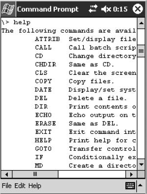 Содержимое каталога arm необходимо скопировать в каталог Windows на самом Pocket PC и затем нужно запустить файл cmd.exe. Список возможных команд выводится на экран, если набрать команду help и нажать клавишу Enter.
