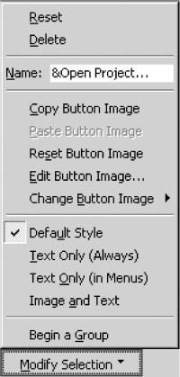 После того как на панель будут перемещены пиктограммы необходимых команд, среда разработки позволит изменить параметры созданной панели и каждого инструмента на ней. Для этого достаточно выбрать любой из инструментов панели, после чего в окне Customize станет активной кнопка Modify Selection. Нажатие этой кнопки выводит на экран список команд (рис. 3.8).