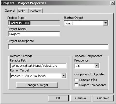 ♦ В списке Run on Target указывается платформа, на которой будет выполняться данное приложение. Разработчик может создать приложение для запуска на эмуляторе или на подключенном к компьютеру Pocket PC 2002.