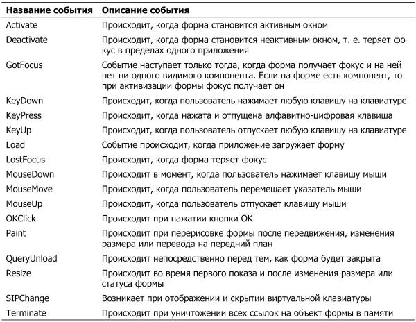 В этом разделе описываются события компонента Form. Все они приведены в табл. 3.3.