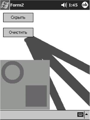 15. Сохранить проект. В качестве целевого устройства нужно выбрать в списке значение Pocket PC 2002 Emulation, после чего следует выполнить команду Run ► Execute. На экран эмулятора будет выведена форма Form1 с нарисованными на ней линиями. После нажатия кнопки Показать на экран будет выведена форма Form2 с нарисованными на ней окружностью и квадратом, а надпись на кнопке изменится на Скрыть (рис. 3.21).
