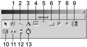На рис. 3.23 изображена палитра встроенных компонентов eVB. Каждый из компонентов на рисунке помечен выноской. Краткое описание каждого из компонентов в соответствии с номером на выноске приведено в соответствующем списке.