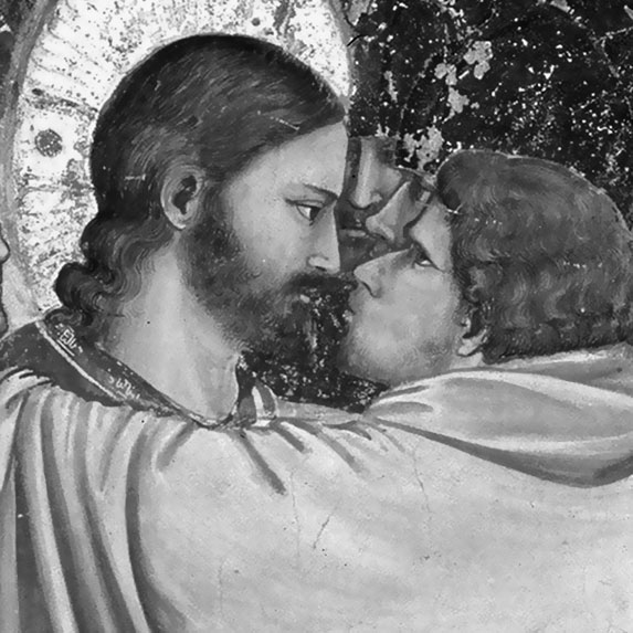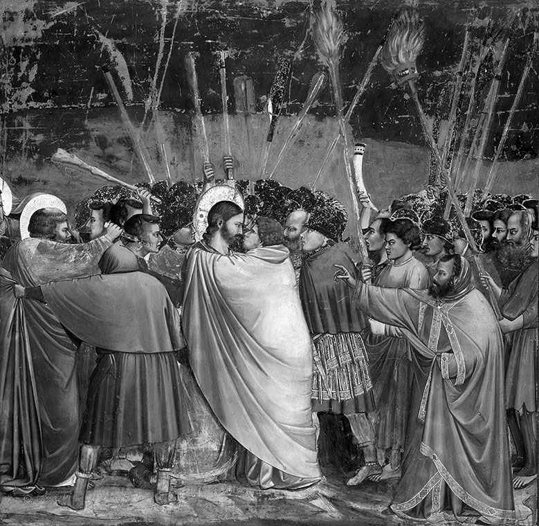 Это потрясающе, но в европейском искусстве такого вообще никто не делал, когда центром композиции являются даже не два лица, а психологическое состояние. Внутреннее состояние… Потому что между этими двумя людьми происходит безмолвное объяснение, объяснение глазами. Видно, что нескладный, уродливый, отвратительный тип Иуда Искариот всматривается в лицо Христа, он ищет для себя какой-то ответ, не оправдание даже своего поступка, а что-то, чего он не знает, что он хочет узнать, что является причиной его такого страшного падения. А Христос не отвечает ему взглядом, у него в глазах Иуда не может прочитать абсолютно ничего. У Иисуса спокойное лицо, он спокойно на него смотрит, он не презирает его, но спокойно смотрит, отражая его взгляд. Это называется пауза. Вот эта пауза лучше всего удается в кино, и эту «дуэль глаз» и паузу сейчас можно видеть в театре. Это – зависшая пауза. И нам кажется, что происходят очень бурные действия, а на самом деле действие останавливается в кульминационной точке… Ведь в этой трактовке Джотто он его не целует. Он только приблизился для того, чтобы его поцеловать. Здесь что-то такое есть, что понятно только этим двум людям и больше никому. Здесь есть такое объяснение, которое только между двумя людьми, и оно главное, потому что поцелуй это уже следствие, это уже точка, это финал.