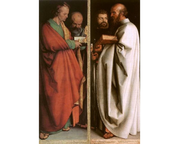 И позади всех этих апостолов он написал их изречения, и подарил эту картину городу Нюрнберг: «Гражданам моим, моим соотечественникам. Бойтесь лжепророков!» Это не означало, что они были примитивны в своей религии. Они были людьми нового времени. И Тициан знал, что внутри человека живет не ангел, и что любовь не может стать ангельским преображением. Он знал, что внутри живет хтоническая беспощадная мечта, предопределяющая круг и его финал.