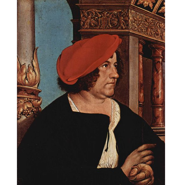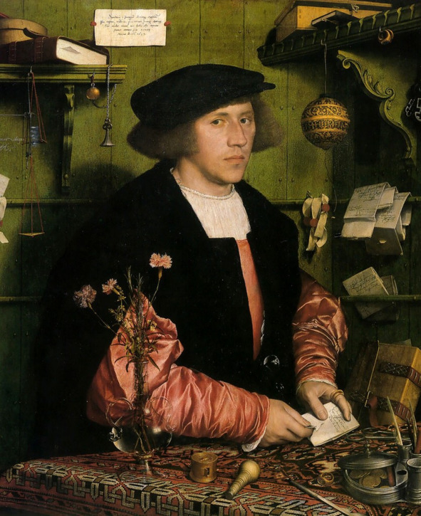 Посмотрите, как написан флакон с гвоздиками. Гольбейн потрясающе писал ткани одежды. У него есть композиционная динамика и его модели имеют движение. Они всегда напряжены, но их движения чувствуются во времени. Если есть какая-то интонация, то он передает ее напряжение. Что в этом случае сообщает нам картина? В мире все спокойно. Спокойно лежат вещи. Вроде фигуры неподвижны, но Гольбейн передает их движение. Корпус повернут. Плечо смотрит на нас, а голова в другую сторону. Глаза устремлены куда-то еще. Это и есть внутреннее напряжение. Он его ухватил. Таким приемом впоследствии пользовались многие художники. Нидерландские мастера передавали за счет несоответствия масштаба картины и масштаба фигуры. У них фигуры очень стиснуты, а здесь все спокойно.