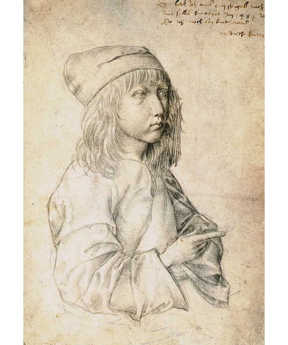 Поскольку у нас с вами объем большой, то я хочу рассказать вам о мастере Дюрере. Наверное, в искусстве есть три человека, которые очень глубоко относились к своим автопортретам. Это Рембрандт, Ван Гог и Дюрер. Я – бедная, несчастная Паола Волкова не могу справиться со вторым томом. И у меня там есть глава «Опыт самоанализа». Дюрер писал свои автопортреты с первого момента и до последнего. Как немец он был аккуратен и подписывал свои автопортреты. Над самым первым, сверху он написал: «Это я – Альберт Дюрер, мне 9 лет» и пальчиком так показывает.