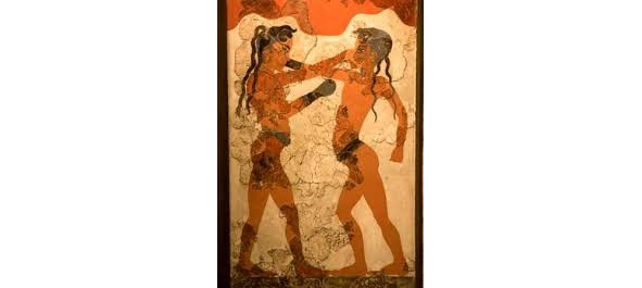 И он идет среди ириса, среди цветов. Они все время среди цветов. И он кого-то ведет за собой, и мы знаем, что он, конечно, ведет за собой быка. А на этой фреске детки с азартом боксируют.