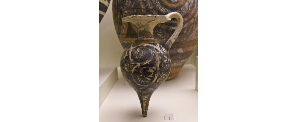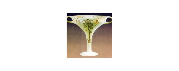 На нем лилии белые изображены и на ножке. За что его хватать – неясно, скорее всего вот за эти ручки. Килик на высокой ножке, Микенская эпоха 13 век до н.э.