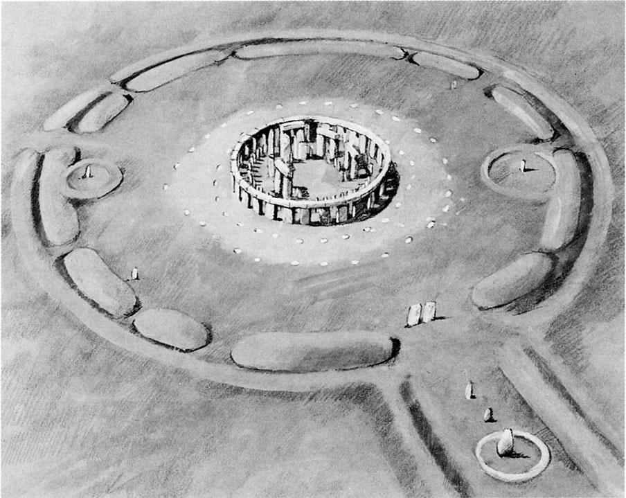 Мы ничего не знаем о строителях. В прах рассыпался мир временный, остался истинный и абсолютный, доказывающий, что мифология исторична, а наука сильна тайнописью. Все, что создавалось когда-либо, имеет свою реальную среду творения: культуру, людей, погоду, еду, взаимоотношения. Это, скажем, строительные леса культуры. Они смываются временем, остается лишь предмет строительства и наши гипотезы о нем. Такие храмы, как Стоунхендж, обязательно возводятся «для кого-то». Кругом было людно. К святилищу (и это несомненно доказано) вели дороги паломников, особенно в большие праздники, обычно связанные с циклами природы. «Там чудеса, там леший бродит». Там был магический театр чудес, театр ритуалов и мистерий. Несомненно, театр превращений и метаморфоз. Глобус Стоунхенджа служил площадкой представлений, того действия, что разворачивалось в параллельной, мистериальной жизни. Жрецы и участники действа всегда выступают в гриме, масках, особом платье. Драматургия действия заранее расписывалась, т. е. имела сценарий. Они были проводниками, посредниками между макро- и микро-миром, поскольку назначение Стоунхенджа как храма Солнца – Луны вполне космо-эзотерическое. Из-за бытовых пустяков такие святилища не возводят, не тратят столько сил и средств. Стоунхендж – двойной глобус: внутренний малый, скажем, земной, и внешний космический – солнечно-лунный, и они связаны и соединены архитектурой святилища.