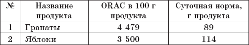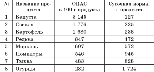 Суточную норму я рассчитала исходя из среднего значения 4000 ORAC (рекомендованных учеными 3500–4500 ORAC). Так что употребите вы чуть больше или чуть меньше ORAC – не слишком важно. А вот в 2–3 раза больше – очень здорово. Сравняетесь с долгожителями.