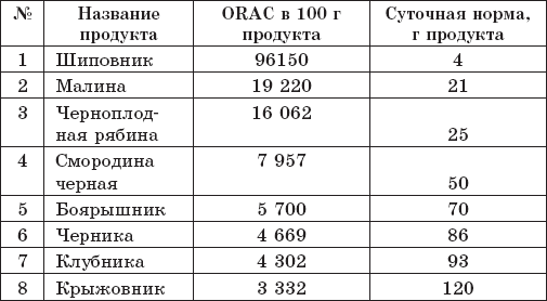 Ну а те, кого эти списки не устроят, а захочется чего-нибудь более экзотического – добро пожаловать в Приложение 1 – там вы найдете более полный перечень продуктов и их показатели ORAC. Но снова предупрежу – не стоит полностью доверять этим цифрам, они в разных источниках иногда различаются в разы – в зависимости от того, продукт какого происхождения исследовался: дикая малина, выросшая в экологически чистом лесу, уж слишком сильно отличается от малины, выращенной рядом с автомобильной трассой у нас на даче.