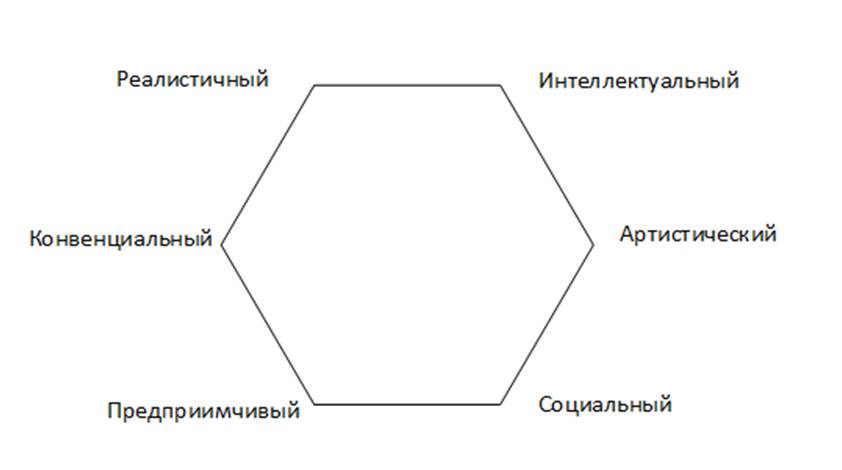 Модель Голланда интересна еще тем, что позволяет увидеть не только близкие, но и противопоказанные человеку виды деятельности. Шесть типов личности сгруппированы друг с другом по степени сходства в форме шестиугольника (см. рисунок). Каждый тип наиболее схож со своими соседями и наиболее отличается от противоположного типа личности.