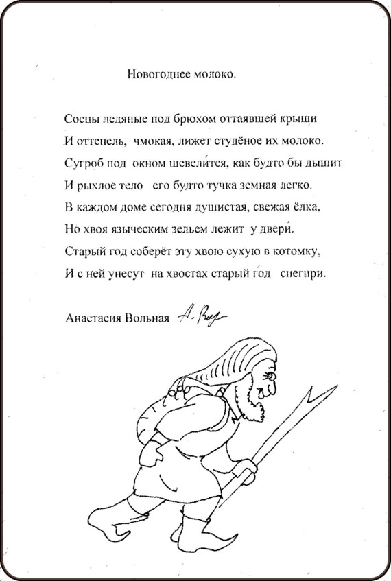 Краснощёкая АринаВ белоснежной пелерине,Шла по воду с ледянымКоромыслом расписным.Серьги из рябиныУ зимы Арины,Волосы серебряны – ветер января.Сказочной снегурочкой Арина прослыла.Синими сугробами, как вОлнами морЯ,Буйствуют, волнуются русские поля.Звонкий колокольчик тройку веселит,И церковный купол небо золотит.Дремлет между избами мёрзлый ручеёкВ маленькой деревне, что между двух дорог.Доброславы, Акулины —Все приветствуют Арину,Выйдя на порог.1995 год