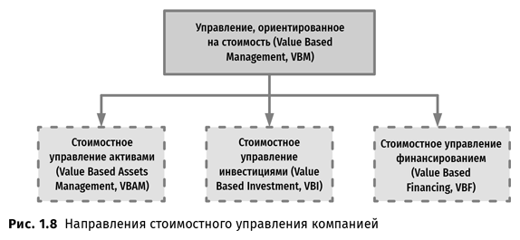 Именно эта идея стала фундаментом современной финансовой аналитики и управления. Рост стоимости компании обеспечивается ростом суммарной прибыли, снижением трансакционных и других видов издержек, увеличением объемов продаж, формированием конкурентных преимуществ и т. п. Таким образом, ориентация на стоимость не противоречит функциональным целям операционной, маркетинговой, инновационной и финансовой деятельности. Став продолжением стоимостной аналитики, стоимостная модель управления (Value Based Management, VBM) получила свое развитие в 1980-е гг. не только в США, но и в Европе, и в Японии, а в 2000-х гг. ее активно стали использовать российские компании.