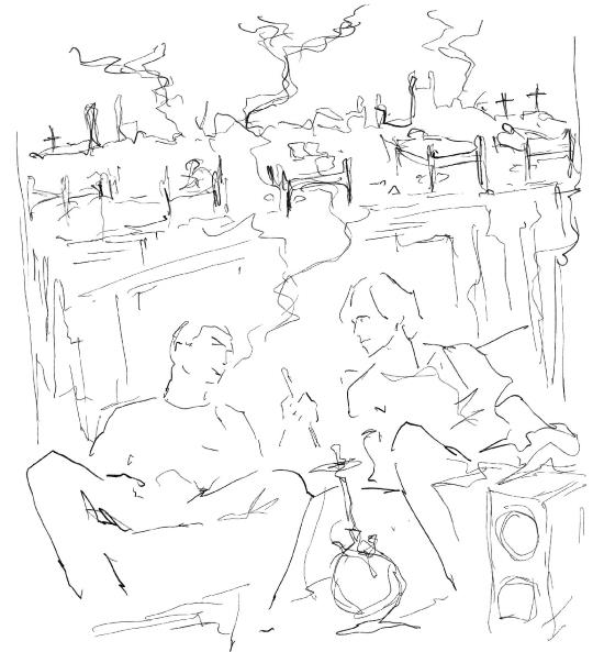Басист вернулся, пролезая мимо Маруси к стенке, небрежно провёл рукой по её предплечью, примостился к ней лицом, в полоборота к нам, взял за кисть.