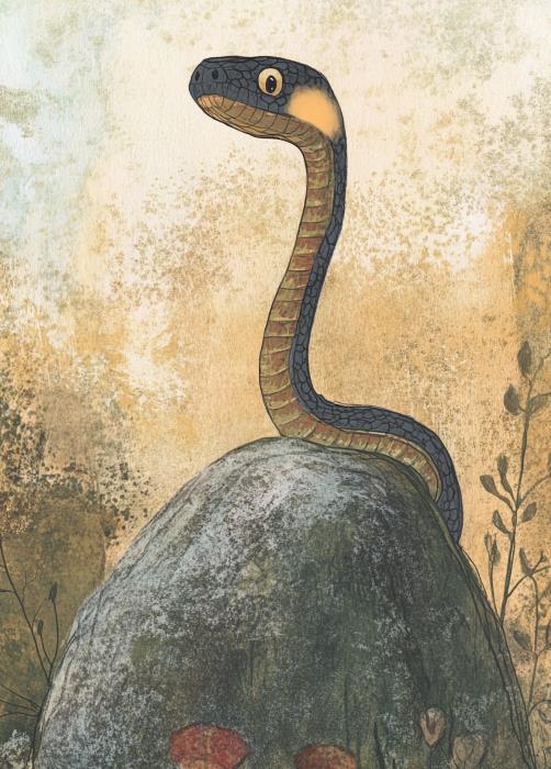 Тут Алёшке и попался старый уж. Конечно, Алёшка обошёл бы его стороной, если бы не остров Невезения и не грустная мелодия в животе. Старый уж лежал, свернувшись кольцом на чёрном камне, и спал. А хвост ужа свисал с камня, словно говорил: «Схвати меня!»