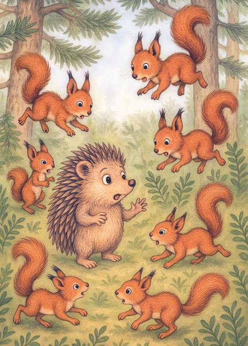 Ежонок решил, что у него случилось головокружение и зрениедесятидвоение, а вместе с ним и раздвоение личности, о котором он прочитал в одной умной книжке. Алёшка зажмурился и уселся прямо на сосновые шишки, а когда вновь открыл глаза, то куча-туча белок никуда не делась. Они все цокали, прищёлкивали языками и восторженно скакали вокруг ежат.