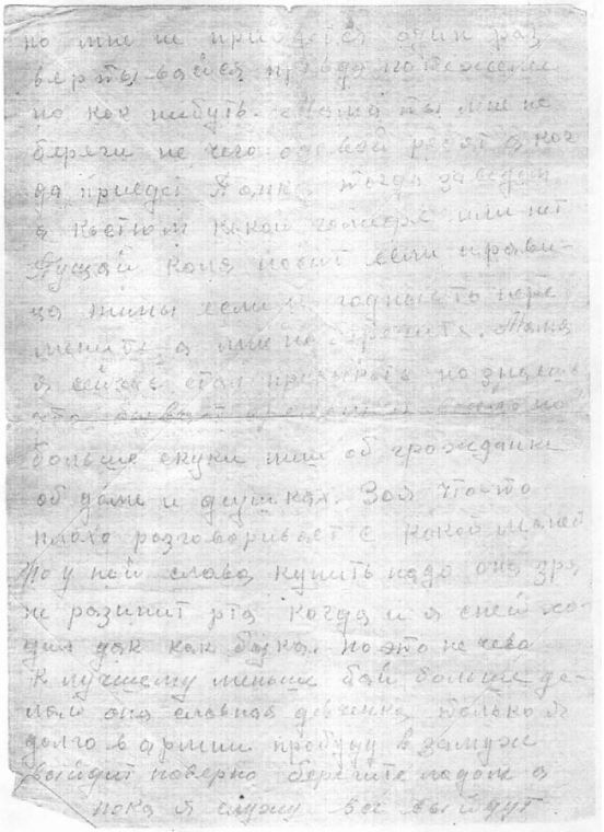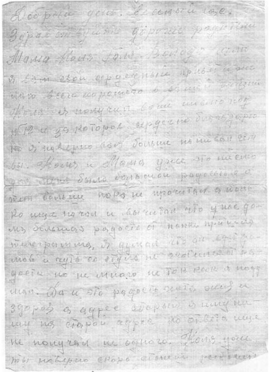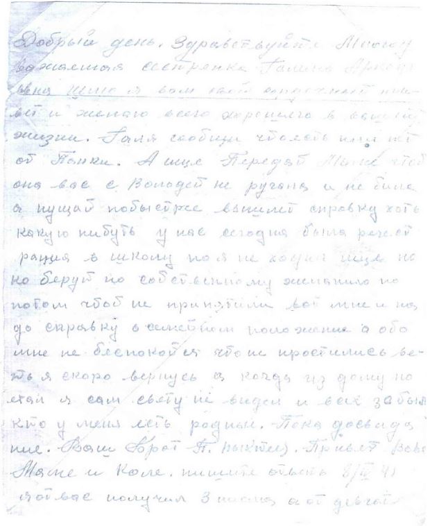 Добрый день. веселый час. Здравствуйте дорогие родители Мама Коля Галя Володя шлю я вам свой сердечный привет и желаю всего хорошего в вашей жизни Коля я получил ваше письмо под № 12 и за которое сердечно благодарю но я наверно сам больше написал чем вы. Коля и Мама уже это письмо для меня было большой радостью я же больше пока не прочитал а только еще начал и вычитал что у нас дома большая радость от папке пришла телеграмма. Я думал что он едет домой и чуть со стула не скотился от радости но не много не так как я подумал. Да и это радость хотя жив и здоров а адрес старый я иму пишу на старой адрес но ответа ище не получал не одного. Коля дом ты наверно скоро станешь рыбачить, но мне не придется один раз вертывайся правда по тяжелел но как нибудь. Мама ты мне не береги не чего одевай ребят а когда приедет Папка тогда заведем а костюм какой галифе или нет. Пущай Коля носит если нравица пимы если годные то юре мените а мне не берегите. Мама я сейчас стал привыкать но знаешь что бывает армейское веселье, но больше скуки пише об грожданке об доме и дедушках. Зоя что-то плохо разговаривает с кокой Маней Но у ней слова купить надо она зря не разинет рта когда и я с ней ходил дак как бука. Но это не чево К лучшему меньше бай больше делай она славная девченка только я долго в армии пробуду в замуж выйдит наверное берегите ладом а пока я служу все выйдут.