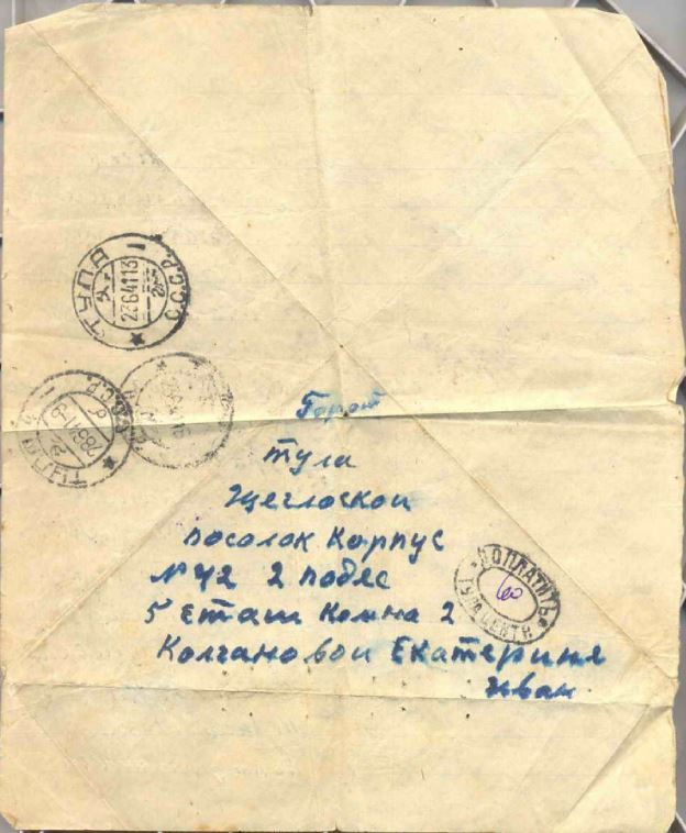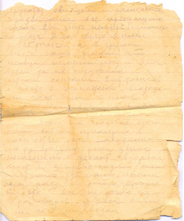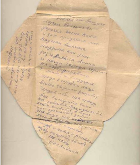 Писмо от вашего мужа Колчанова дорогая жена Катя и Зоя придется мне наднях выехат нафронт как унас разгорается война и наши города германя бобордировала г. минск и следущие города 3 города и наши войска ступили защиту городов и бои но я прошу вас смотрите сами как хотите так и делаите хотя в живите в туле или поезжаите домои дело ваше как хотите если я вернус со фронта живои то я приеду ктибе и хотя и раненои буду но приеду кти но пока досвиданя