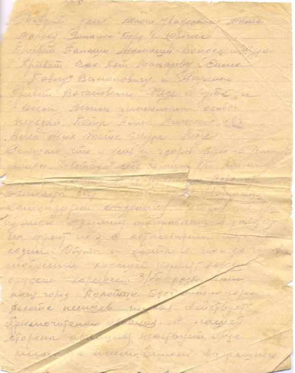Привет Вагановым Феде и Гуте и всем моим знакомым особо передай Петр Алек Алексею Ив. Алек. Мих тете Шуре, Лизе Сообщаю что жив и здоров того и Вам желаю. Чувствую себя хорошо. От меня (…) (…) (…) (…) (…) командиром отделения. Сегодня из моего отделения отправлены в разведку на фронт но я с остальными еще ходил. Обуты и одеты я с ног до головы залюбуешься хорош кормят хорошо оружие хорошее 3/VII разбомбили наш город Полотцк Бесильно горел Пехота немцев – шакал. Действует исключительно авиация. С нашей стороны авиация участвует еще плохо за исключением вчерашнего дня. Сбито немецких самолетов 87 наших 28. На нашем фронте как будто была частично измена дело выправляется сейчас. Начинают появляться наши истребители над головой без прерывно летают самолеты по обстрелу нас небыло жду сообщения разветки готовлюсь к бою. Зина пиши как ты живеш (…) нет Борис с Юрой Боря (…) (…) (…) (…) (…) (…) (…) (…)