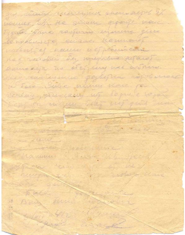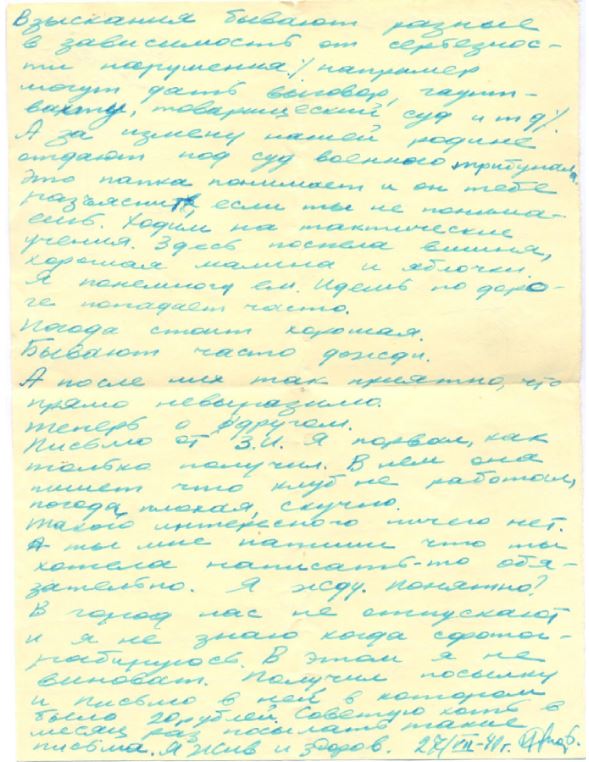 В город нас не отпускают и я не знаю когда сфотограбируюсь. В этом я не виноват. Получил посылку и письмо в ней в котором было 20 рублей. Советую хоть в месяц раз посылать такие письма. Я жив и здоров. 27/VII-41г. (подпись)