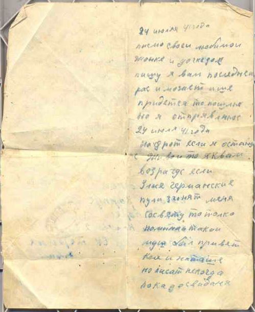 письмо своеи любимои жонке и дочке зое пишу я вам последнеи рас и может ише придется то пошлю но я отправляюс 24 июля 41 года на фронт если я останус живои то я квам возрачус если злые германские пули згонят меня сосвету то толко поминаи такои муш был привет Коле наташе но писат некогда пока досвиданя