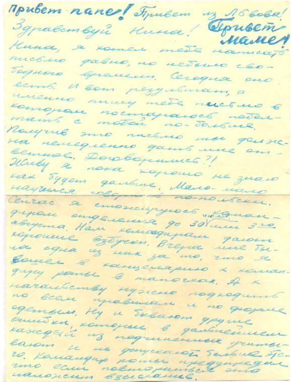 Привет папе! Привет из Львова! Здравствуй Нина! Привет маме! Нина, я хотел тебе написать письмо давно, но небыло свободного времени. Сегодня оно есть. И вот результат, а именно пишу тебе письмо в котором постараюсь поболтать с тобой по-больше.