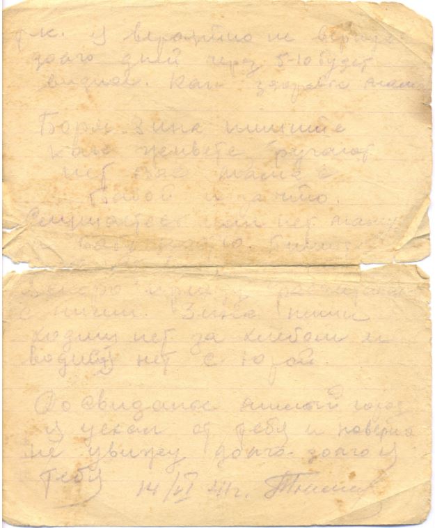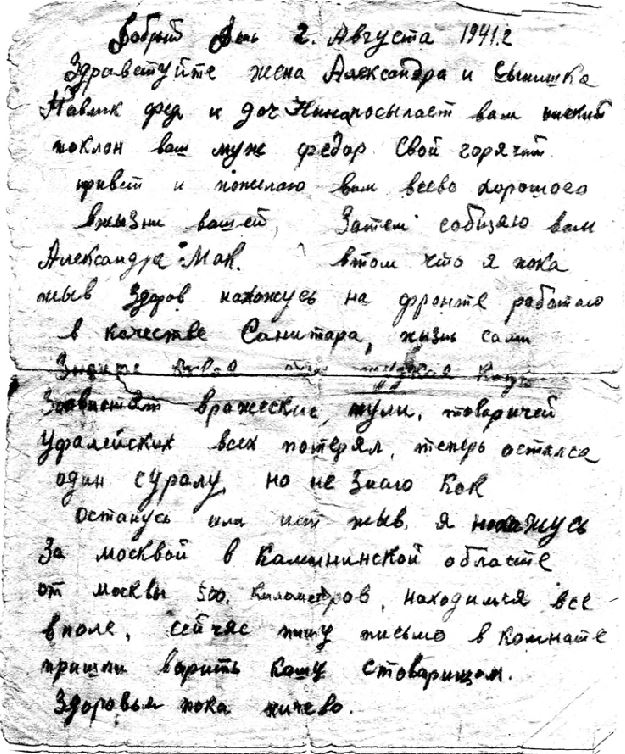 Здравстуйте жена Александра и сынишка Павлик фед. и доч Нина посылает вам ниский поклон ваш муж федор Свой горячий привет и пожелаю вам всево хорошего вжызни вашей, Затем собщаю вам Александра Мак. втом что я пока жыв здоров нахожусь на фронте работаю в качестве Санитара, жизнь сами видите вся (…) Когда свистят вражеские пули, товаричей Уфалейских всех потерял, теперь осталса один с уралу но не знаю как останусь или нет жыв, я нахожусь за москвой в Калининской областе от москвы 500 километров, находимся все в поле, сейчас пишу письмо в комнате пришли варить кашу стоварищем.