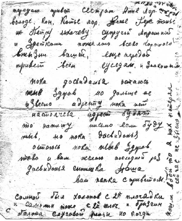 передаю привет сестрам Анне Лар. володе, Кон. Катье лор. Тете Гере танье Петру Лихачеву супругой Апрошкой и здетками пожелаю всего хорошего вжызни вашей, еще передай привет всем суседям и знакомым.