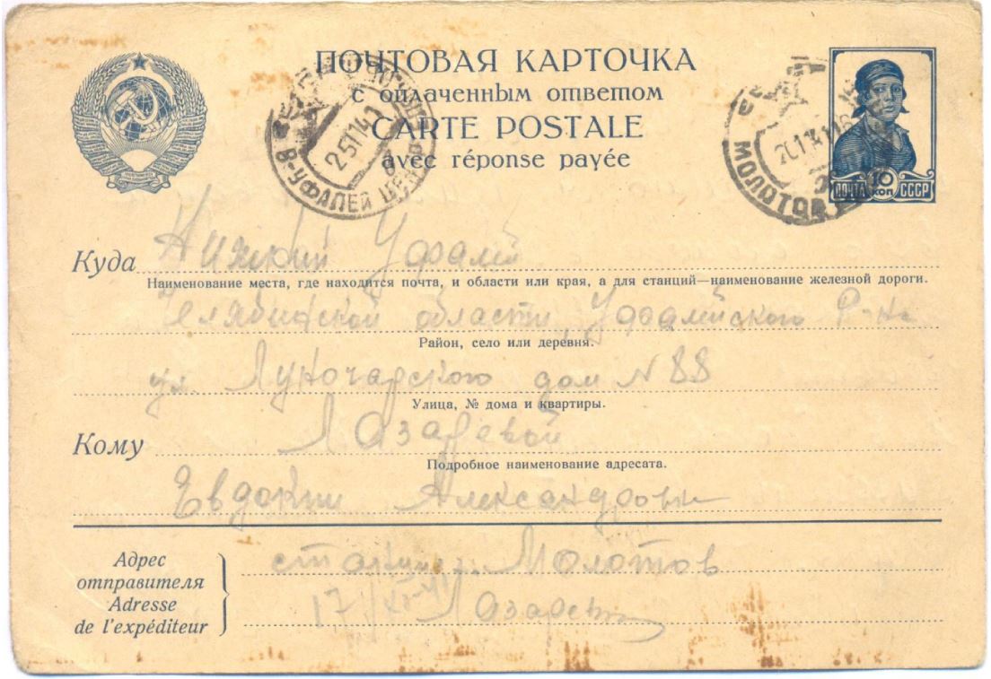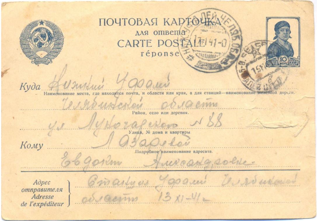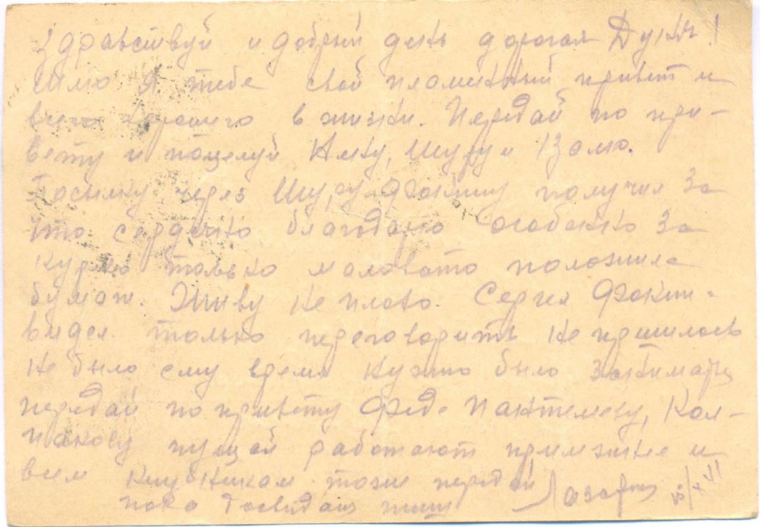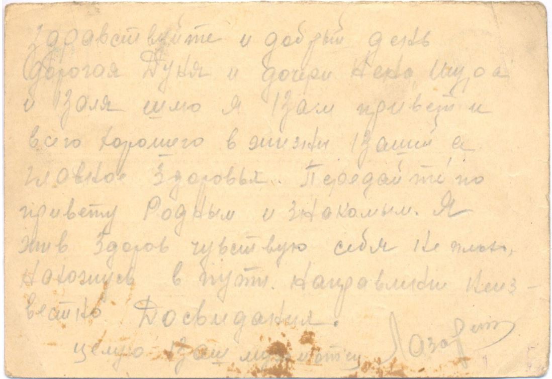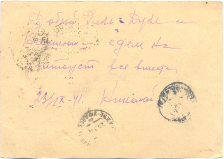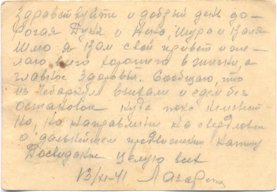 Здравствуйте и добрый день дорогая Дуня и Нина, Шура и Валя Шлю я вам свой привет и желаю всего хорошего в жизни, а главное здоровья. Сообщаю, что из Чебаркуля выехали и едем без остановок куда пока неизвестно, но направление на свердловск о дальнейшем продвижении напишу Досвидание целую всех