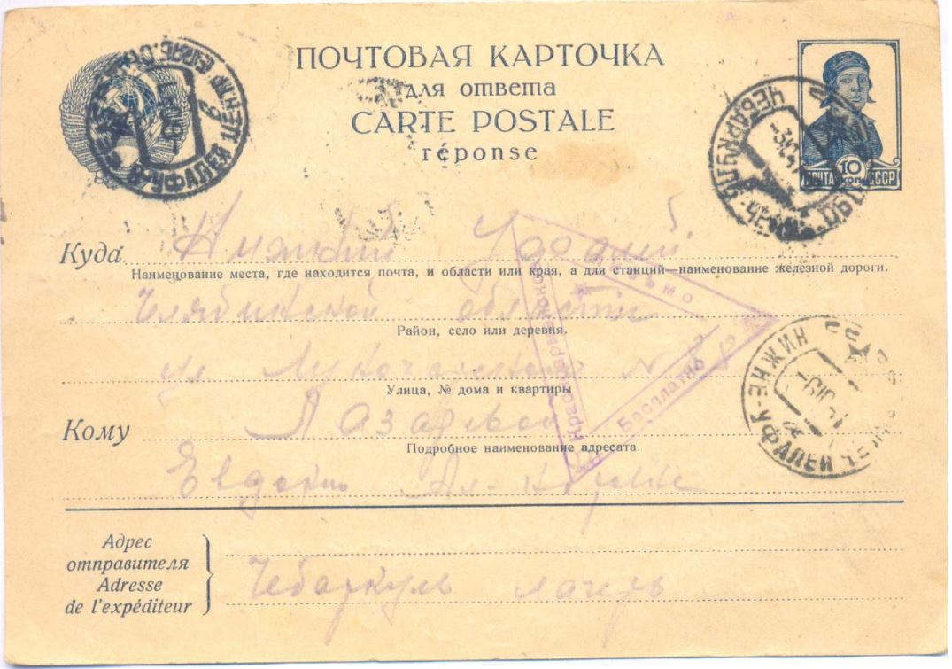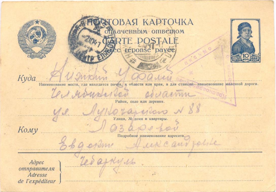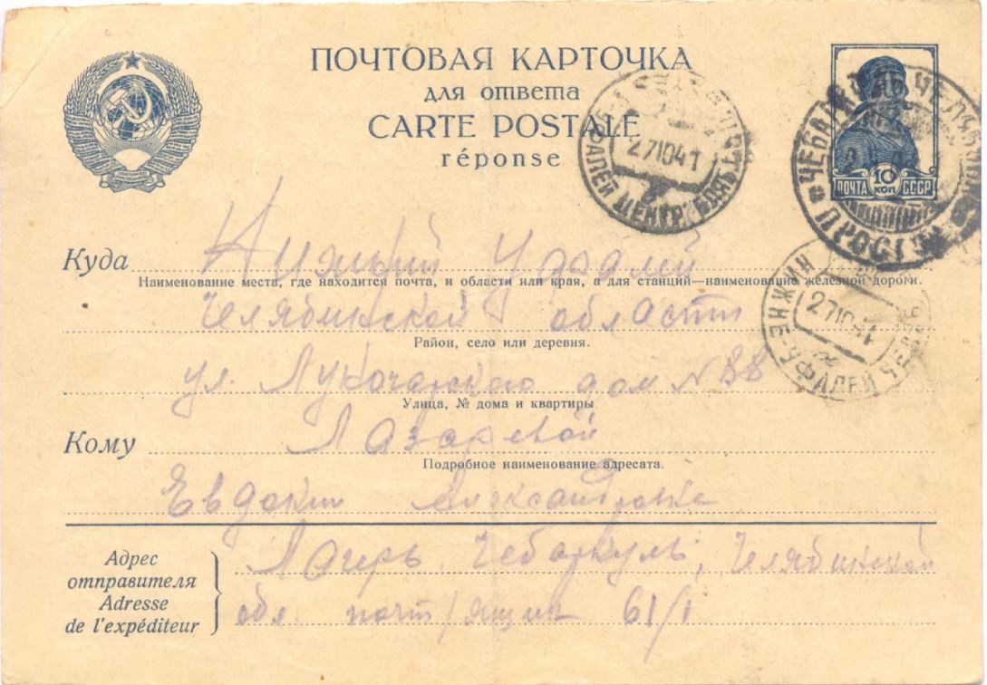 Номер полевой почты (станции и т.д.) – Лагерь Чебаркуль; Челябинской обл. почт/ящик 61/1