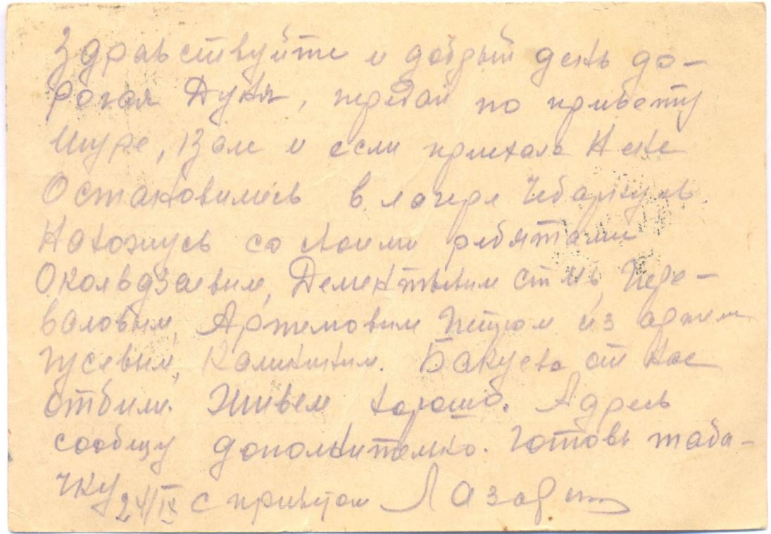 Здравствуйте и добрый день дорогая жена Дуня, передай по привету Шуре, Вале и если приехала Нине Остановились в лагере Чебаркуль. Нахожусь со своими ребятами Окольдзаевым, Дементьевым Ст Ив, Переваловым, Артемовым Петром из архим Гусевым, Калининым. Бакуева от нас отбили. Живем хорошо. Адресь сообщу дополнительно. Готовь табачку