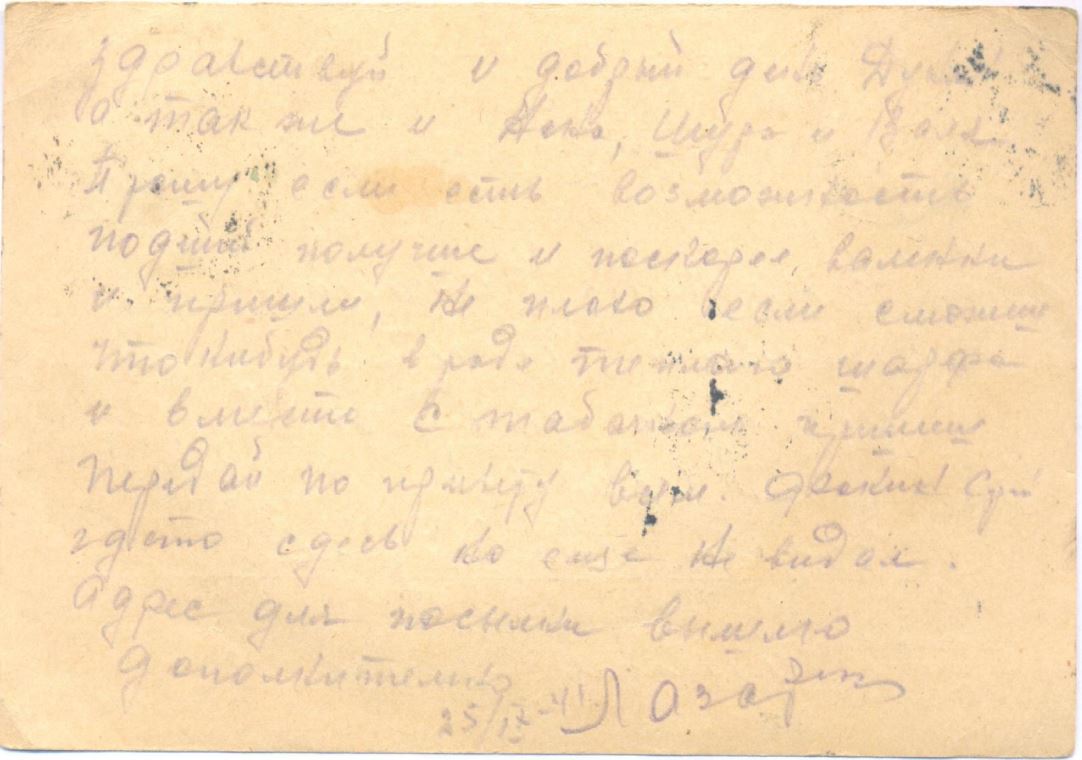 Здравствуй и добрый день Дуня а так же и Нина, Шура и Валя. Прошу если есть возможность подшит получше и поскорее валенки и пришли, не плохо если сможеш что нибудь в роде теплаво шарфа и вместе с табачком пришлеш Передай по привету всем Фокин Серг гдето сдесь но еще не видал. Адрес для посылки вышлю дополнительно 25/IX-41 (подпись)