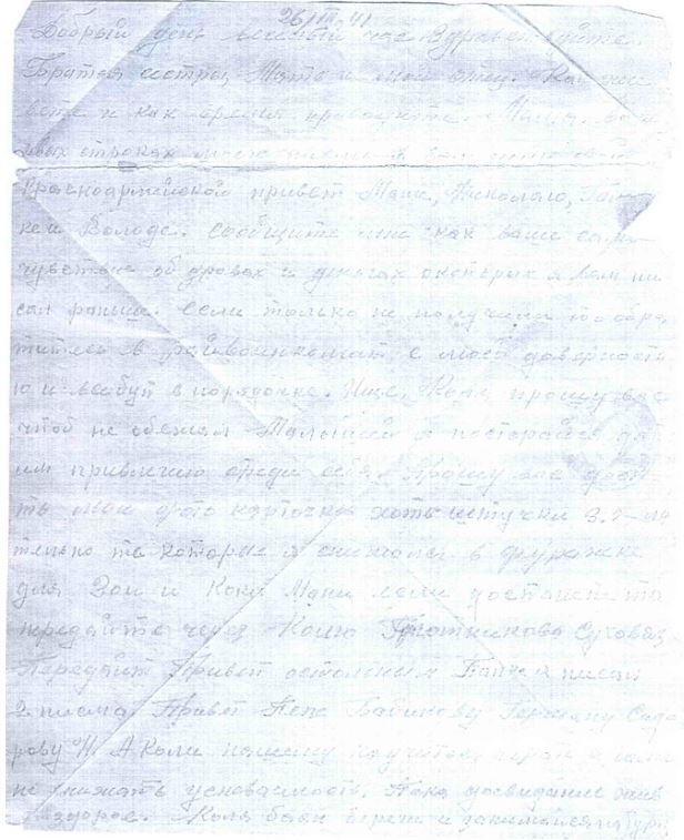 Добрый день веселый час. Здравствуйте. Братья сестры, Мать и мой отец. Как живете и как время проводите. Мама вопервых строках моего письма к вам шлю свой красноармейский привет Маше, Николаю, Гальке и Володе. Сообщите мне как ваше самочувствие об дровах и деньгах о которых я вам писал раньше. Если только не получили то обратитесь в райвоенкомат с моей доверностью и все бут в порядочке. Ище, Коля прошу вас чтоб не обижал Малышей а посторался дат им привлегию среди себя. Прошу вас достать мои фото карточки хоть штучки 3 жилательно те которые я снимался в фуражке для Зои и Коки Мани если достаните то предайте через Колю Плотникова Суховяз Передайте Привет остальным Папке я писал 2 письма. Привет Пете Бабикову, Герману Сидорову Н. А Коли нашему научиться играть, а Гале не снижать успеваемость. Пока досвидание жив и здоров. Коля баян береги и занимайся на тур.