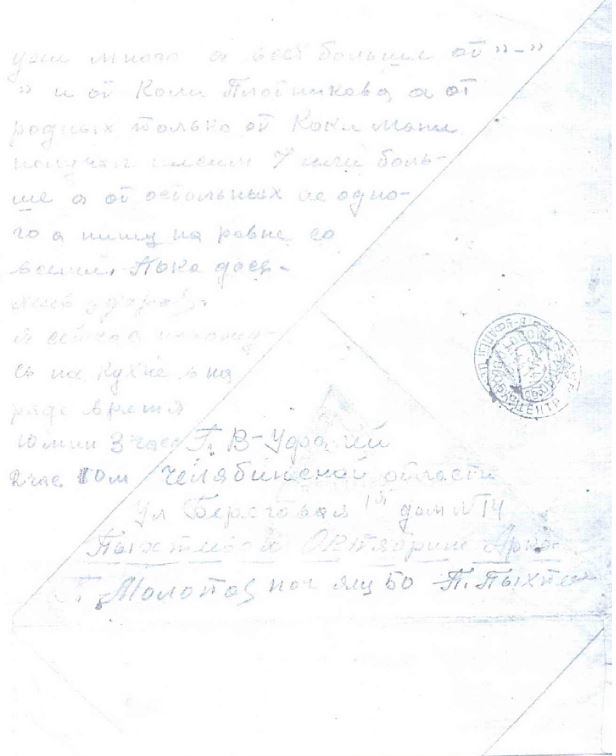 Добрый день. Здравствуйте Многоуважаемая сестренка Галина Аркадьевна шлю я вам свой сердечный привет и желаю всего хорошего в вашей жизни. Галя сообщи что есть или нет от Папки. А еще Передай Маме чтоб она вас с Володей не ругала и не била а пущай побыстрее вышлет справку хоть какую нибуть у нас сегодня была регестрация в школу но я не ходил еще но но наберут по собственному желанию но потом чбоб не принят или вот мне и на до справку о семейном положении а обо мне не беспокойся что не простились ведь я скоро вернусь а когда из дому по ехал там я сам свету не видел и всех забыл кто у меня есть родные. Пока досвидяние. Ваш Брат П. Пыхтеев. Привет Вове Маме и Коле. пишите ответь 8/IV 41 я от вас получил 3 письма а от девчат уже много а всех больше от "-" и от Коли Плотникова а от родных только от Коки Мани получил писем 7 или больше а от остольных не одного а пишу на ровне со всеми. Пока досв. жив здоров. Я сейчас нахожусь на кухне в наряде время 10 мин. 3 часа 2 час 10 м
