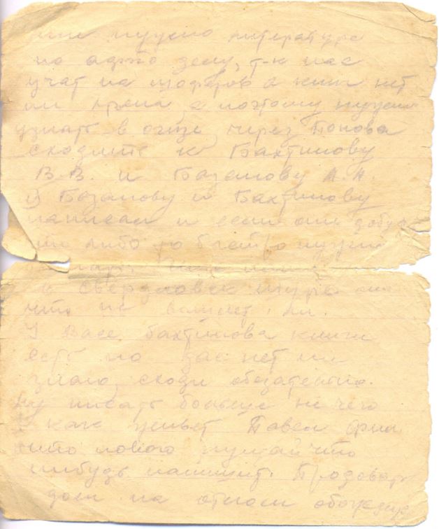 мне нужно литература по афто делу, т-к нас учат на щоферов а книг нет ни хрена, а поэтому нужно узнать в огизь, через Попова сходите к Бахтинову В.В. и Базанову А.А.. Я Базанову и Бахтинову написал и если они добудут то либо то, быстро нужно перепр. Шуре (…) в свердловск Шуре жаль что не вышлет ли. У Васи Бахтинова книги вероятно, дас нет ни знаю, сходи обязательно. Ну писать больще не чего как живет Павел Фил. что нового пущай что нибудь напишут. Продавать дом на (…) обождите т.к. я вероятно не вернусь долго дней через 5-10 будет видно. Как здоровье мам Боря Зина пишите как живете ругают нет Вас мама с бабой и за что слушаетесь или нет маму и бабу. Целую.